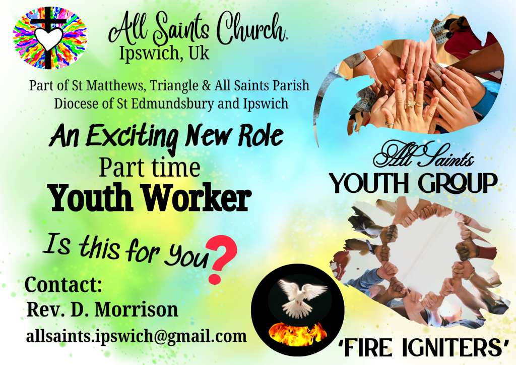 We are currently looking to employ a part-time youth worker to work alongside the current youth team, to lead the youth group, to actively participate in the Sunday youth work, and to encourage and inspire other members of the team. Our vision is young people on fire for God, moving in the power of the Holy Spirit. For details please contact Rev Daniel Morrison by emailing allsaints.ipswich@gmail.com